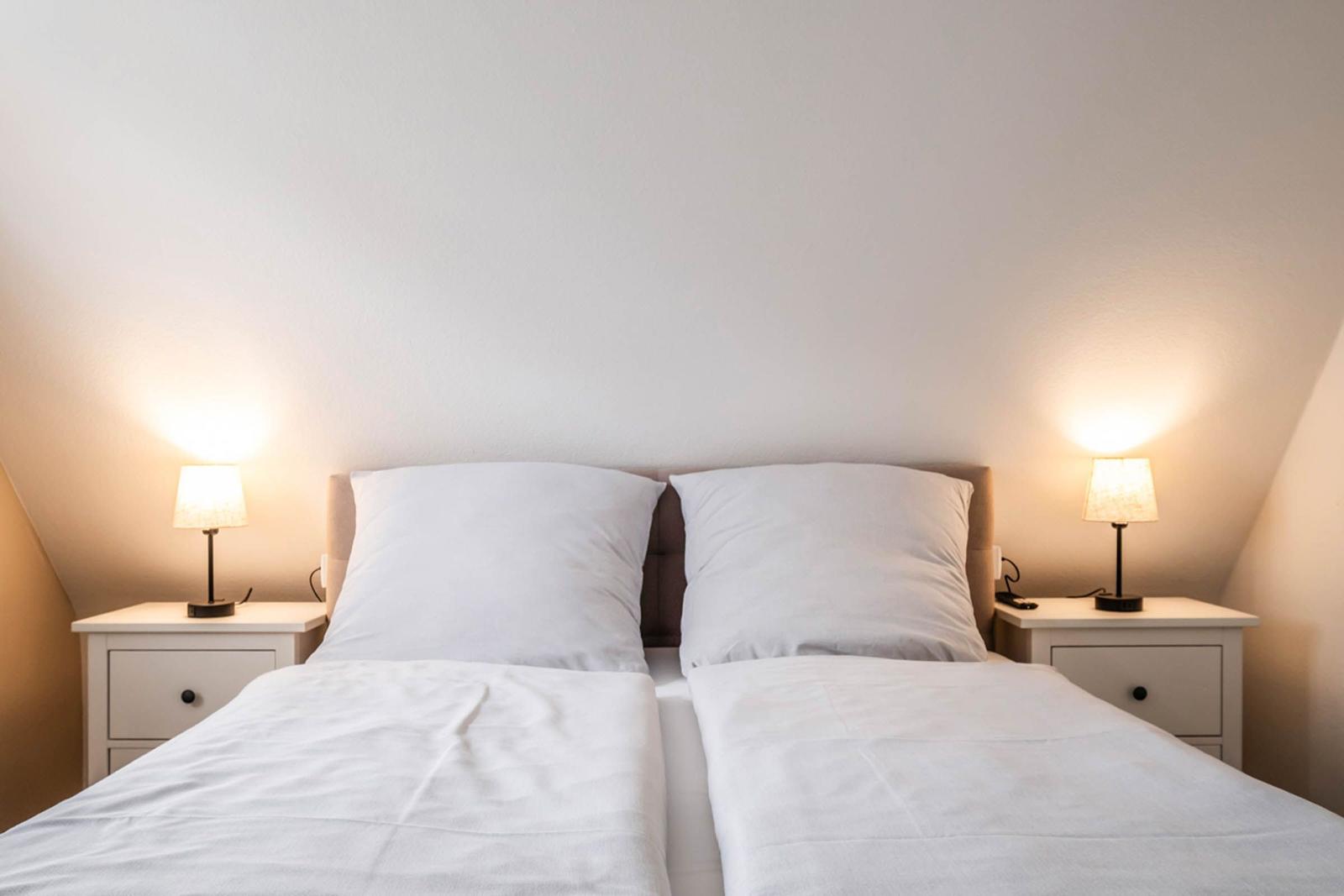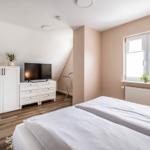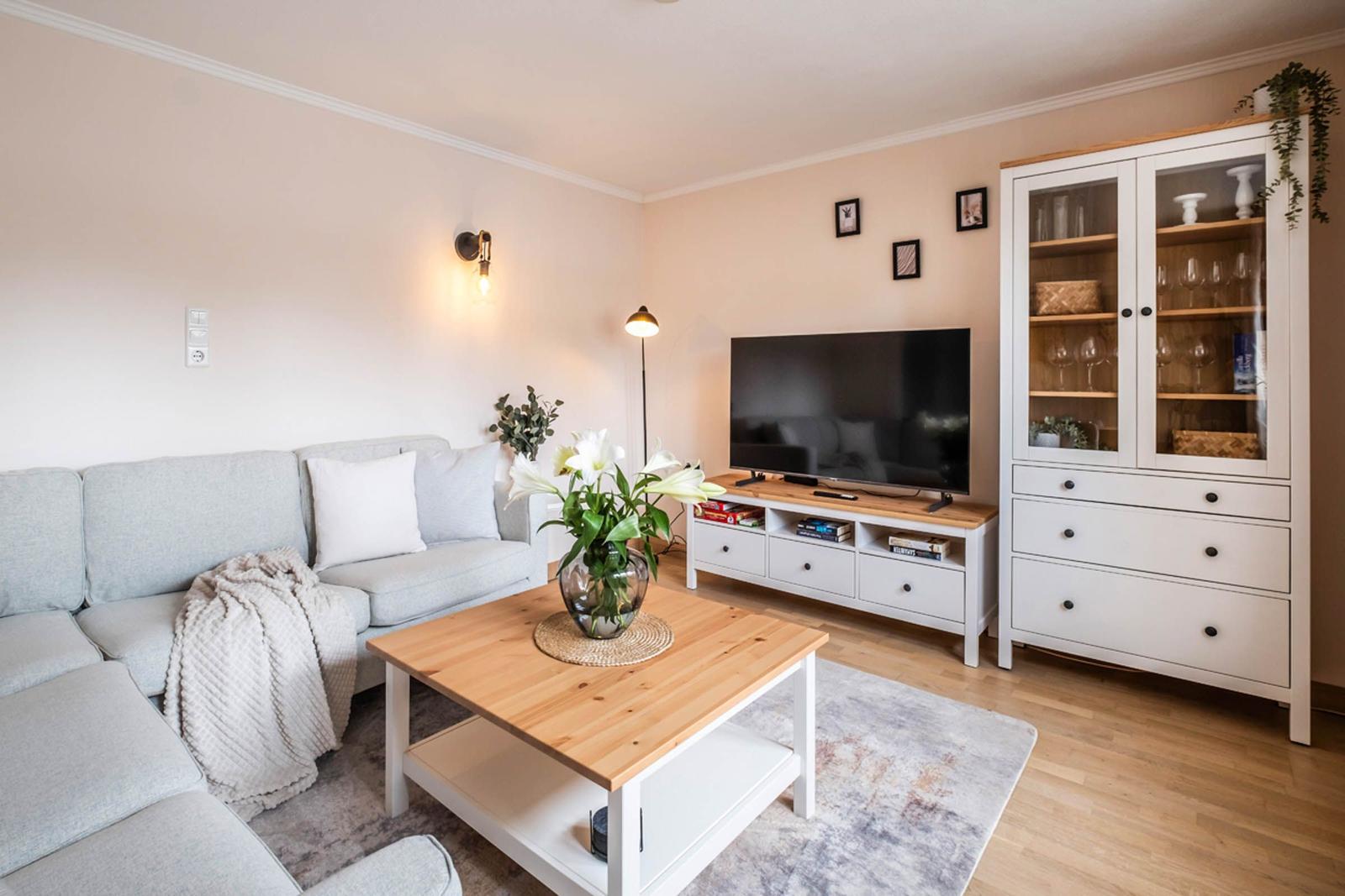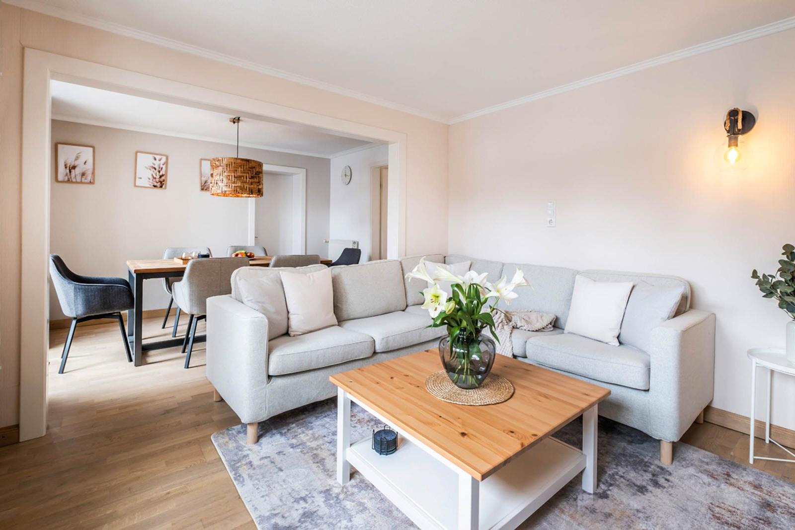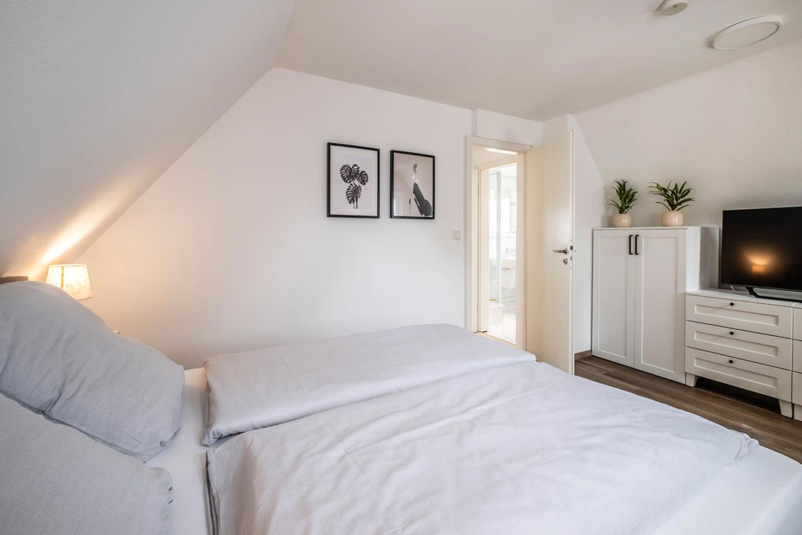 Die beiden Badezimmer sind mit bodengleichen Duschen, einem Haartrockner und einem Fenster ausgestattet, das für zusätzliches Licht sorgt. Ein stilvolles Wohnzimmer mit Sofa und Esstisch lädt zum Entspannen ein. Die Ausstattung umfasst zudem einen TV, eine Waschmaschine, einen Wäschetrockner und einen Wasserkocher. Ein Parkplatz steht zur Verfügung. Sicherheit wird durch Rauchmelder gewährleistet. Die Ferienwohnung vereint Komfort und Funktionalität und ist der perfekte Rückzugsort für jeden Gast.