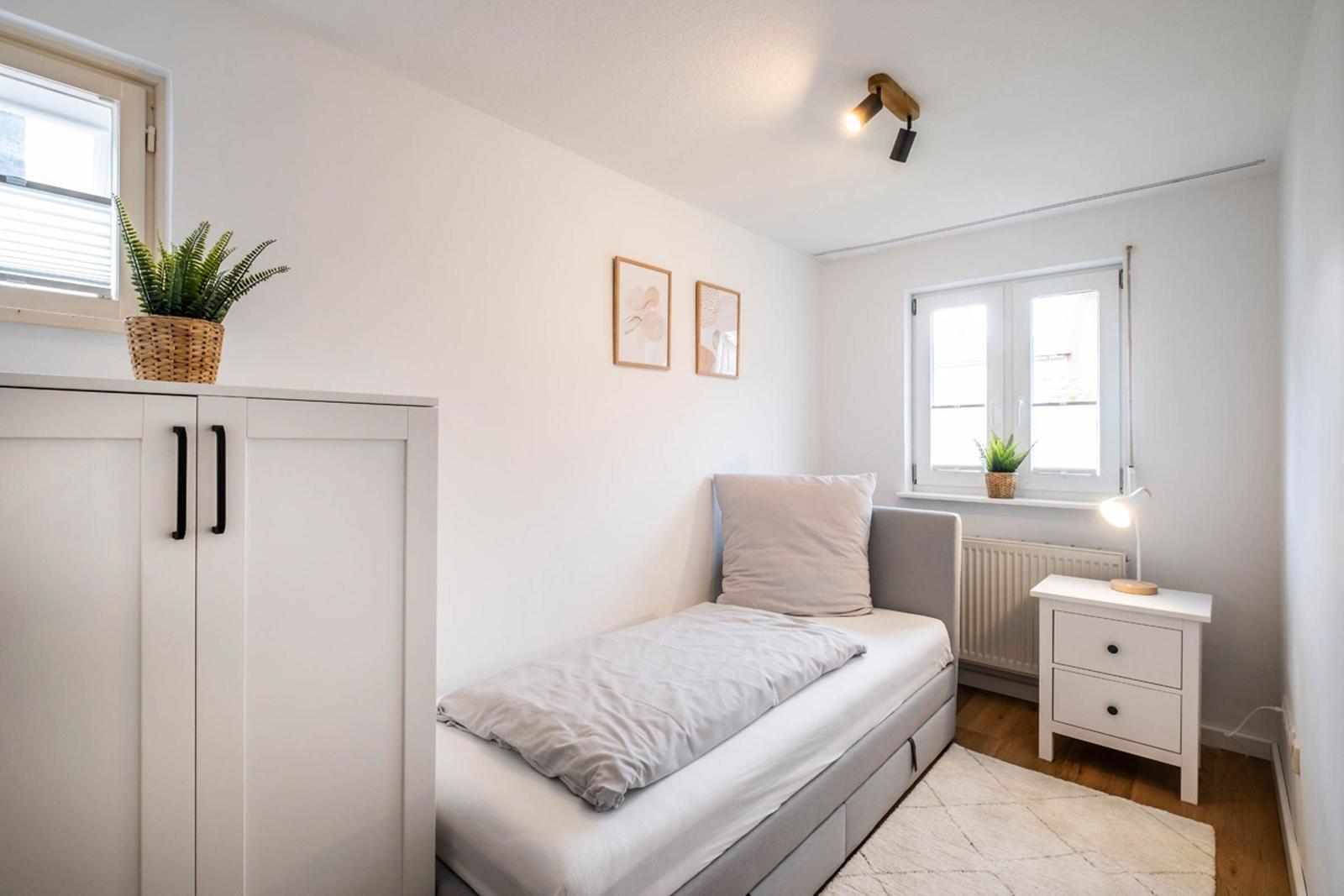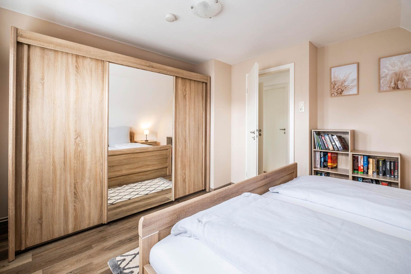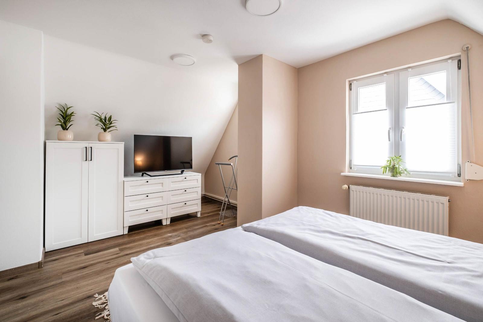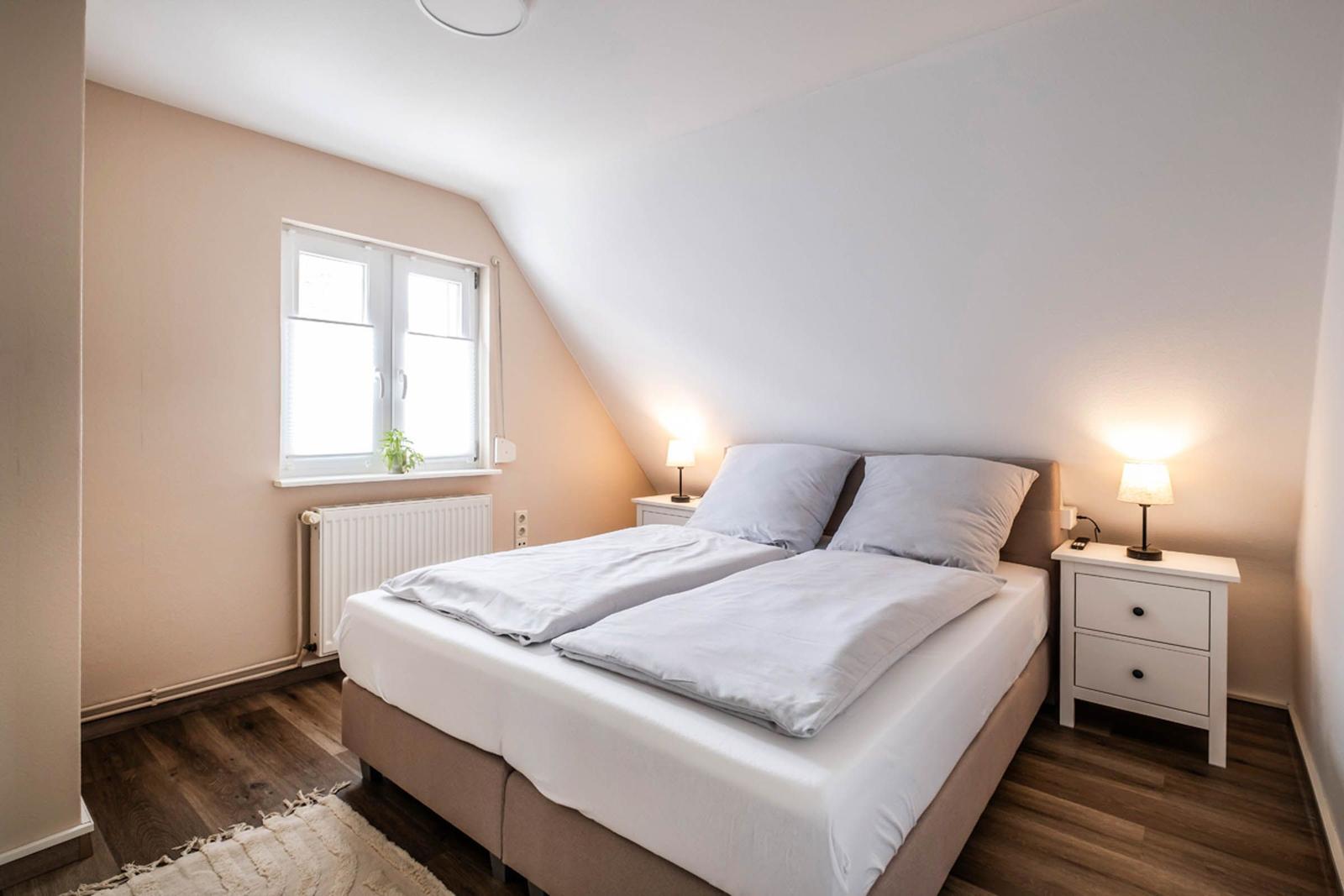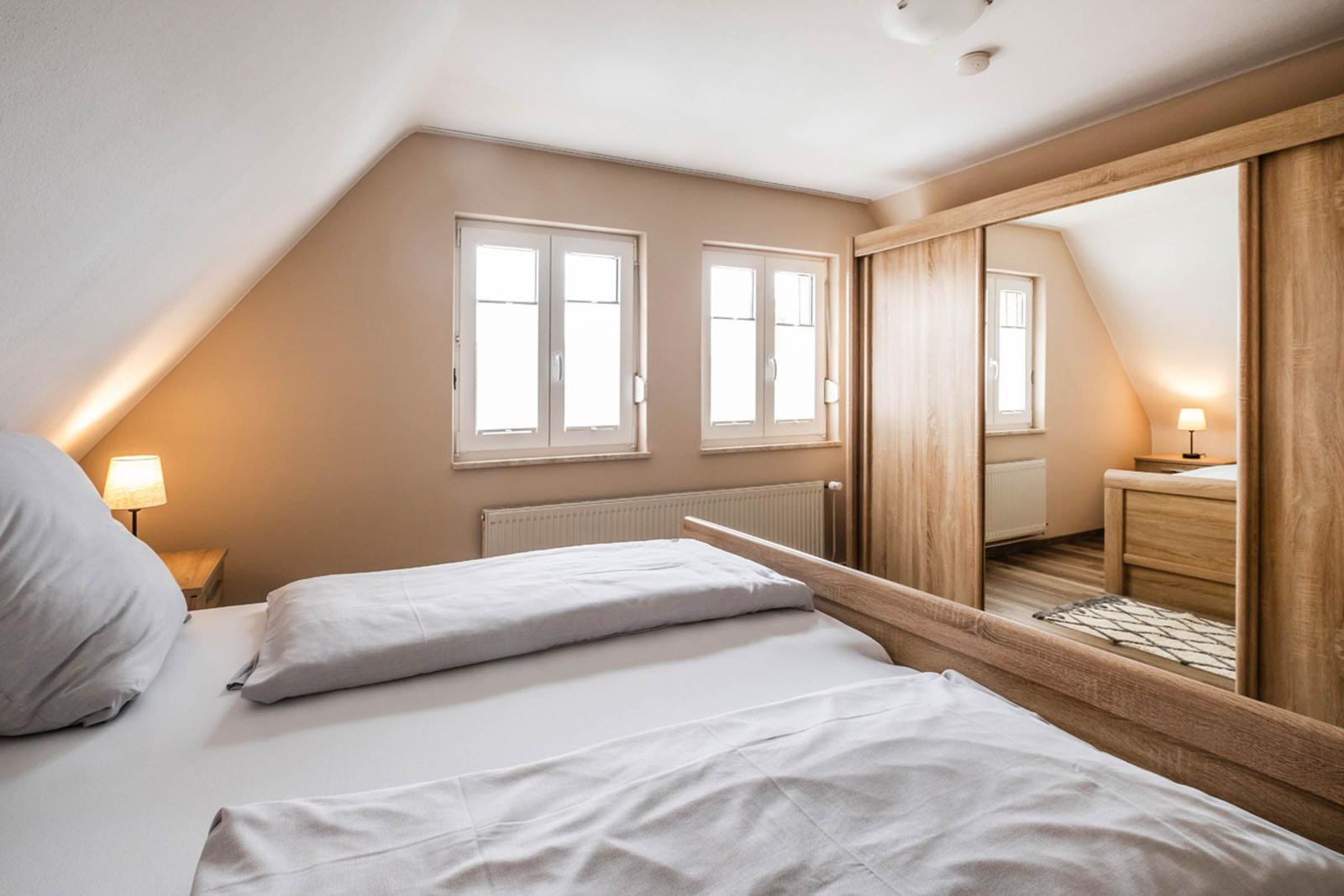 Die beiden Badezimmer sind mit bodengleichen Duschen, einem Haartrockner und einem Fenster ausgestattet, das für zusätzliches Licht sorgt. Ein stilvolles Wohnzimmer mit Sofa und Esstisch lädt zum Entspannen ein. Die Ausstattung umfasst zudem einen TV, eine Waschmaschine, einen Wäschetrockner und einen Wasserkocher. Ein Parkplatz steht zur Verfügung. Sicherheit wird durch Rauchmelder gewährleistet. Die Ferienwohnung vereint Komfort und Funktionalität und ist der perfekte Rückzugsort für jeden Gast.
