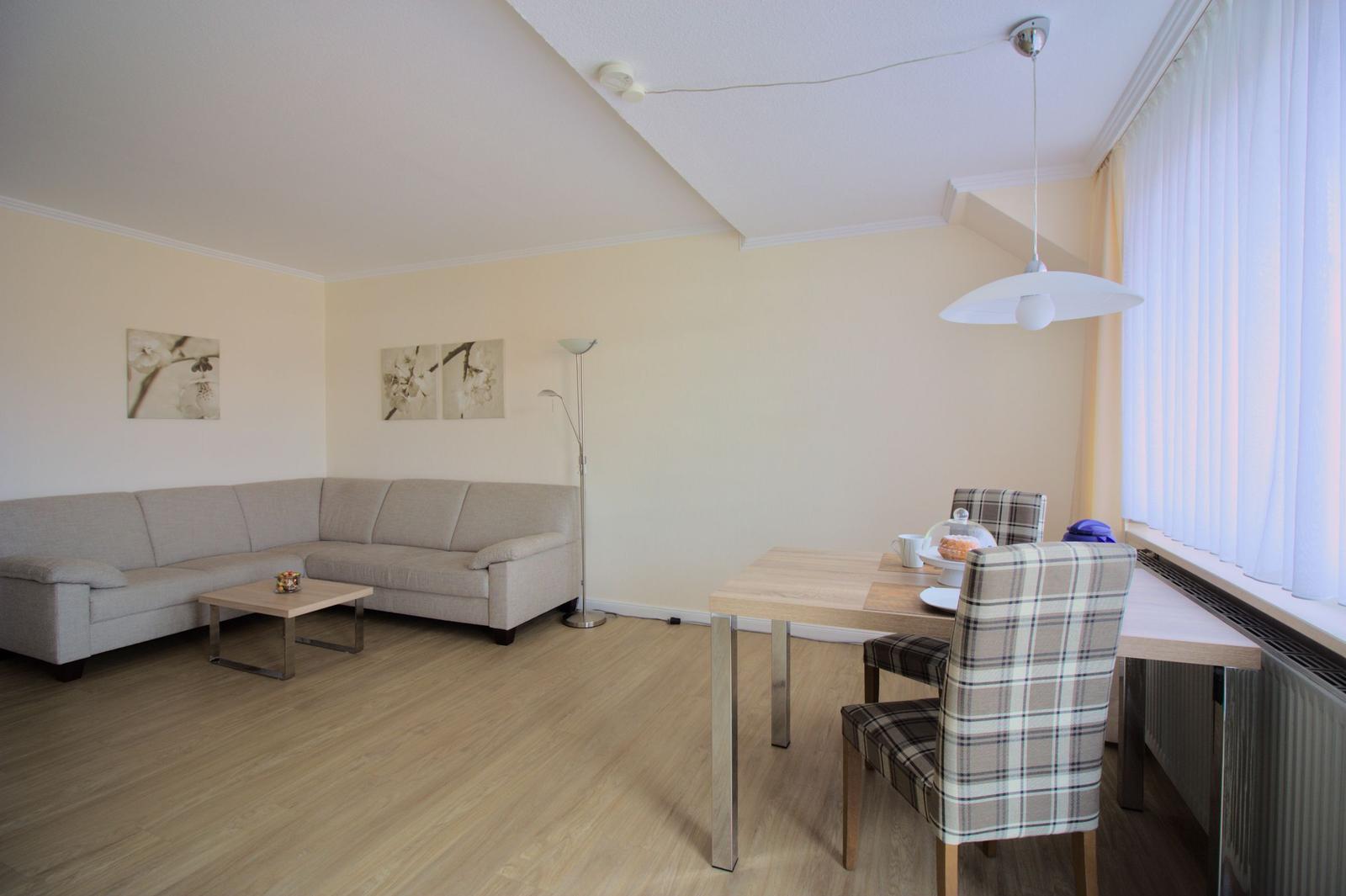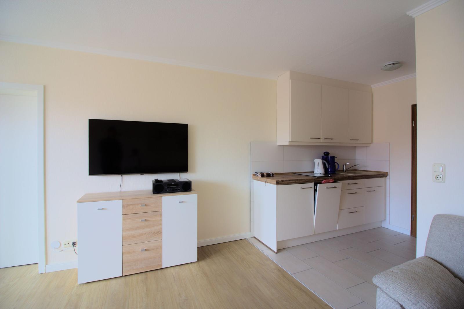 Ein heller Esstisch lädt zu gemeinsamen Mahlzeiten ein. Das Badezimmer ist mit einer bodengleichen Dusche, einem Haartrockner und einem Spiegel ausgestattet. Der Wohnbereich umfasst ein komfortables Sofa, einen TV und eine HiFi-Anlage für entspannte Abende. WLAN-Internet ist ebenfalls verfügbar, und die Wohnung ist allergikergeeignet. Ein Parkplatz steht zur Verfügung. Diese Ferienwohnung ist der ideale Rückzugsort für jeden, der Komfort und eine durchdachte Ausstattung schätzt.