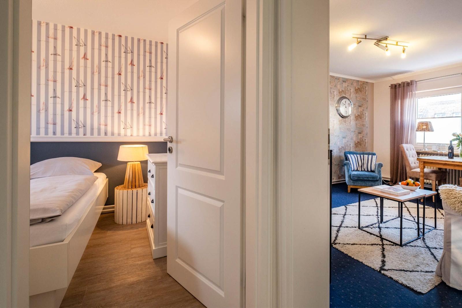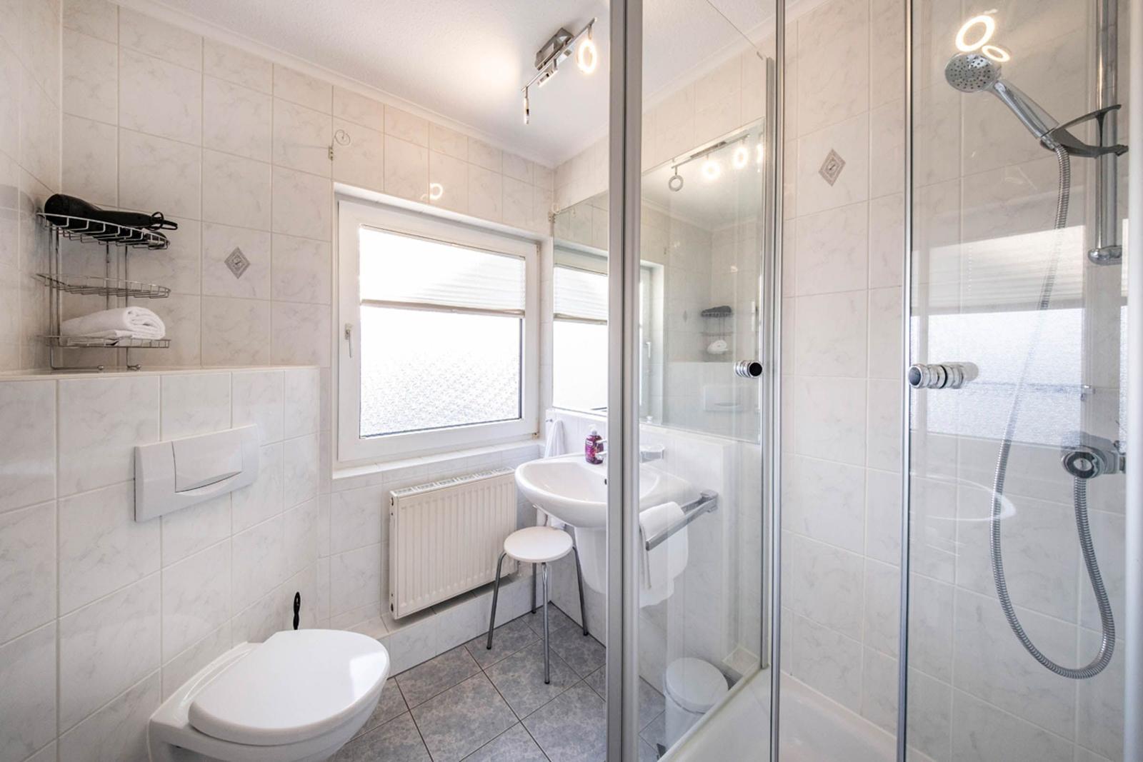 Diese Ferienwohnung bietet eine komfortable und allergikergeeignete Unterkunft für einen entspannten Aufenthalt. Die Räumlichkeiten umfassen ein gemütliches Schlafzimmer mit einem Doppelbett und ein modernes Badezimmer mit Fenster und Dusche. Die separate Küche ist vollständig ausgestattet mit einem Geschirrspüler, Elektro-/Gasherd, Backofen, Mikrowelle, Kühlschrank, Kaffeemaschine, Toaster und Wasserkocher – ideal für die Zubereitung eigener Mahlzeiten.