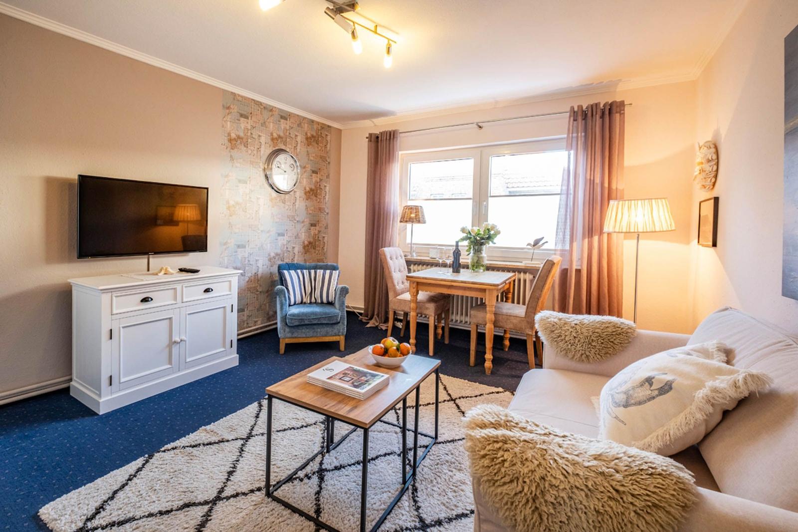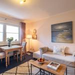 Ein Esstisch sowie Geschirr und Besteck stehen zur Verfügung. Das Wohnzimmer ist mit einem Sofa, einem Sessel und einer HiFi-Anlage ausgestattet und bietet Zugang zu einem TV. WLAN sorgt für durchgehend gute Internetverbindung. Ein Parkplatz ist ebenfalls vorhanden. Die Wohnung verfügt über eine Heizung, die an kalten Tagen für Behaglichkeit sorgt. Geschirrtücher und ein Haartrockner sind ebenfalls inkludiert, um den Komfort während des Aufenthalts zu erhöhen.